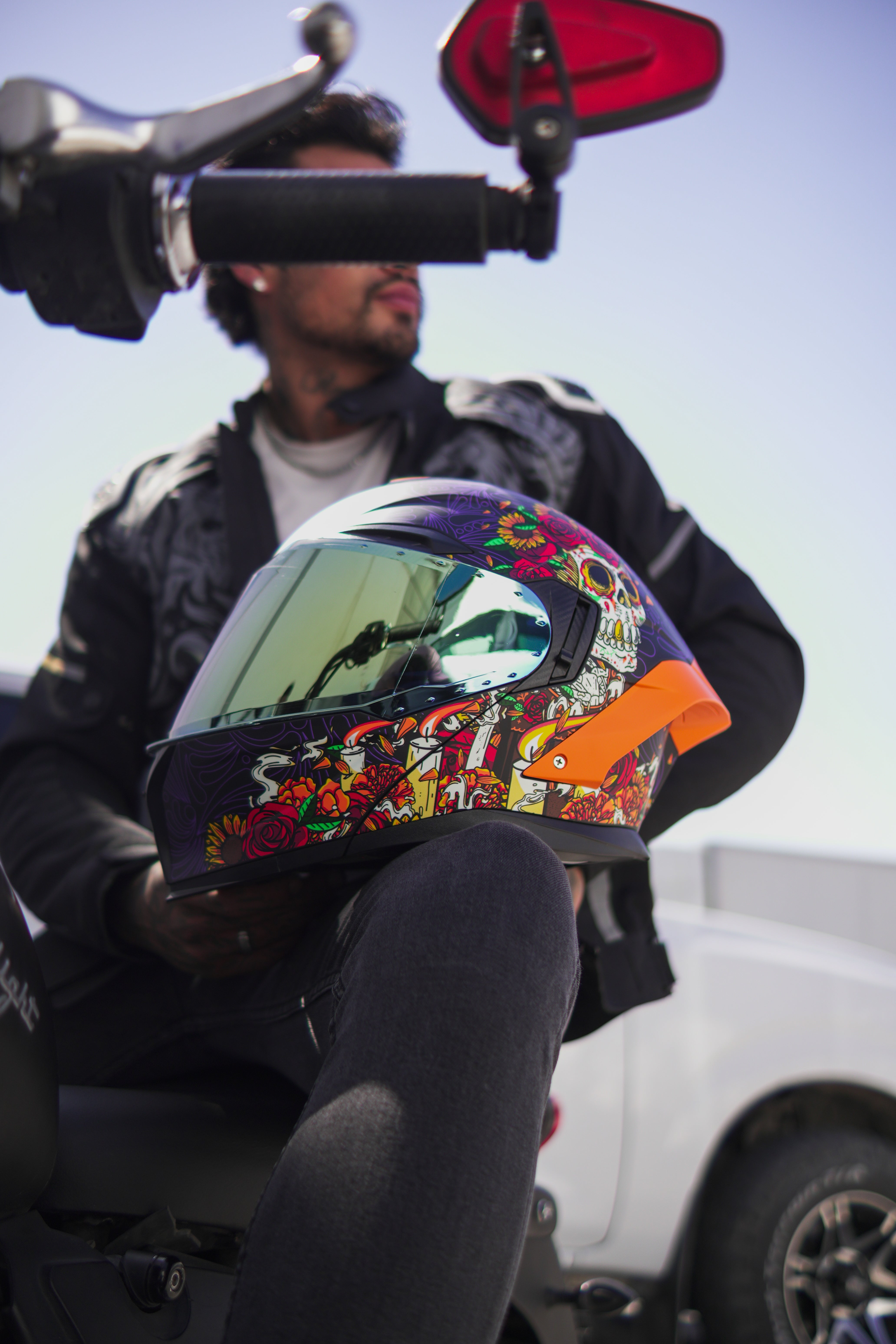 Inspirado en la tradición del Día de Muertos, este casco captura la esencia de la Catrina con detalles en tonos naranja que combinan seguridad y estilo vibrante. 🎨✨