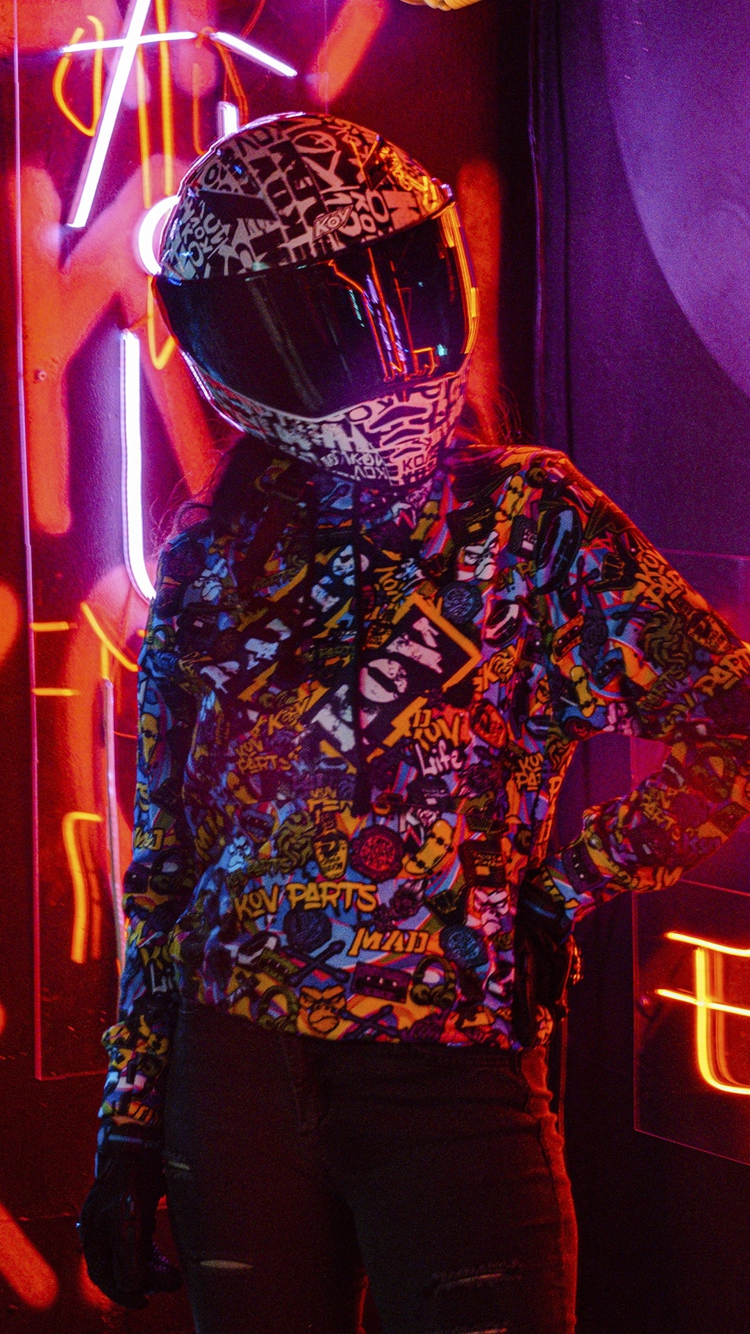 Con un diseño vanguardista inspirado en el caos urbano y la energía del movimiento, este modelo combina seguridad, comodidad y personalidad en cada detalle. Su patrón gráfico en blanco y negro con el icónico logo KOV lo convierte en el favorito de los bikers que marcan tendencia dentro y fuera del asfalto.